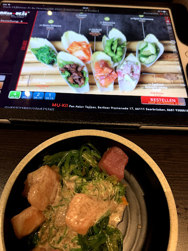 Read moreWir gehen gerne Sushi essen und probieren gerne mal was neues aus. Das Mu-Kii ist modern eingerichtet aber relativ laut. Wir habe an einem Tisch am Fenster gesessen und hatten einen schönen Blick. Der Kellner, der uns begrüßt hat und und kurz erklärt hat wie es funktioniert war sehr freundlich. Das bestellte essen kam sehr schnell. Leider war das Wasabi und der Ingwer an den Rändern schon trocken. Geschmacklich muss ich ehrlich sagen, war das Sushi absolut nicht mein Fall. Entweder war es relativ neutral oder Soja "ver-"salzig. Das Personal hatte seinen Blick nur auf den Bons die am essen klebten um es an den richtigen Tisch zubringen. Dies funktionierte bei unserem Tisch leider nicht. Wir hatten öfter der Bedienung sagen müssen, dass wir dies nicht bestellt haben. Aber auch an dem Tisch neben uns wurde öfter mal was geliefert was nicht bestellt wurde. Da mir das Sushi absolut nicht geschmeckt hat, habe ich Ente und Hühnchen probiert. Bei der Ente war ich anfangs sehr überrascht, weil sie einfach klasse ausgesehen hat. Nach dem ich sie probiert habe, habe ich sie zurück gehen lassen. Die Ente war kalt und die Soße wohl frisch aus dem Kühlschrank. Der Kellner meinte er bringt mir eine neue, allerdings blieb es dabei. Von der Ente habe ich nichts mehr gesehen. Die Mango Limonade war sehr lecker, preislich auch total im Rahmen. Zum Schluß die Bananen, auch sehr lecker, nicht zu süß, genau richtig. Ein dicker Minuspunkt,... bei Kartenzahlung gibt es 2% Aufschlag! Eine bodenlose Frechheit. Wir haben "fast" 2020 in anderen Ländern ist Kartenzahlung gang und gebe.. Zum bezahlen mussten wir dann nochmal einige Zeit warten, der Kellner fragte uns ob alles ok war. Mein -nein- und die Erklärung nahm er sehr gefasst auf und hat sich entschuldigt. Das es ihn interessiert hat nehme ich ihm ab. Das Sushi war teilweise sehr lieblos in eine Schale geklatscht. Ich habe Sashimi Salada bestellt. was an den Tisch geliefert wurde sah eher aus wie Goma Wakame (Seetang) und Sashimi Salada drüber geworfen. Auf den Bildern im Internet und auf dem Tablet schaut alles klasse aus, Wenn es serviert wird eher nicht! Alles in allem sehr enttäuschend und absolut nicht zu empfehlen. Absolute...
