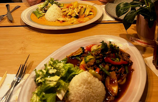 Meine Gäste bestellten Ente und knusperiges Hahnchen. Letzteres schien Formfleisch zu sein, Ente war ok. Bei beiden schwamm der Salat mit Fleisch und Reis in einer gemeinsamen Schüssel in der Soße. Salate mit Mayonnaise-Überzug. Authentisch Thai?