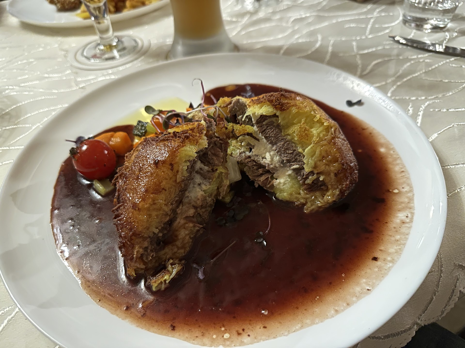 Read moreGutes Restaurant mit schönem Ambiente. Ich hatte eine Art Saltimbocca mit Fisch, meine Freundin die Spezialität des Hauses. Da der Fisch sehr fein im Geschmack war, habe ich die Salbeiblätter entfernt, da diese geschmacklich viel zu intensiv für den Fisch waren. Das Brot, welches als Gruß aus der Küche gereicht wurde, war für mich das Highlight. Oft sind ja die einfachsten Dinge die besten. Das gekochte Rindfleisch im Kartoffelteigmantel, Spezialität des Hauses, war sehr lecker und außergewöhnlich. Der Wein aus Rumänien schmeckte mir nicht und war zu warm. Leider war die Bedienung nicht wirklich aufmerksam und wir saßen lange auf dem trockenen und es dauerte lange bis wir nachbestellen konnten bzw. wir nochmal die Karte gereicht bekamen. Das Restaurant war nur etwas zur Hälfte besetzt. Fazit: Gut, aber deutlich Luft nach oben. In diesem Preissegment erwarte ich...