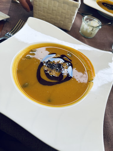 Wir hatten als Vorspeise beide die Kürbiscremesuppe. (laut Karte verfeinert mit einer Note Curry) Ich mag Curry sehr und die Suppe war geschmacklich auch ok aber zu Curry lastig. Als Hauptgang hatte meine Frau das Rahmschnitzel vom Weideschwein und ich das Cordonbleu bestellt. Nach etwa 30 min Wartezeit (absolut ok) kamen aber zuerst die Hauptspeisen ohne, dass wir die Suppe vorher hatten. (Kann passieren, bis hierhin noch nichts schlimmes) Darauf hingewiesen eine kurze Entschuldigung und gleich darauf kam auch die Curry Suppe. Nach fast schon einer Entschuldigung meinerseits beim Oberkellner, dass wir tatsächlich Suppe bestellt hatten kam eine relativ pampige Aussage... Haben sie Suppe bekommen oder nicht? Fanden wir ziemlich daneben.