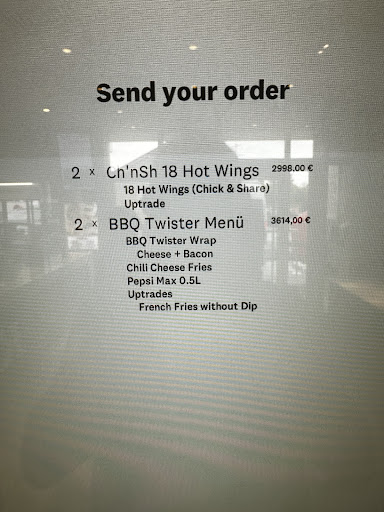 Um 21:01 ein kleines Bucket mit: 2x Pommes, 4 Wings, 2 Filet Bites und 2 Stripes, einem stillen Wasser sowie einem Zinger Burger bestellt.