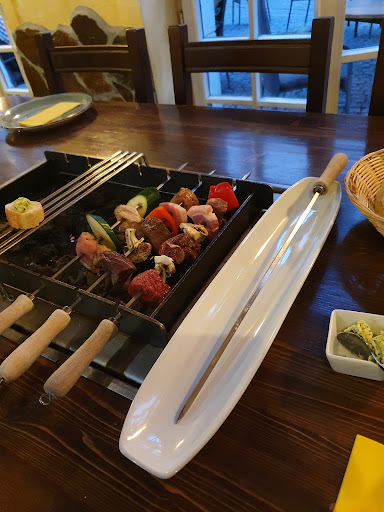 Beim selber Grillen bekamen wir jeweils eine Grillplatte mit einer ordentlichen Portion rohem Fleisch. Dazu kamen mehrere Schüsseln mit Soßen, zwei Salaten und rohem Gemüse. Die Spieße stellt man sich dann natürlich selber zusammen und hängt diese danach auf den Grill. Wenn das Fleisch fertig ist bekommt man noch eine Schüssel mit Pommes.