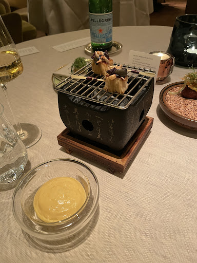 Imagine that YOU 🫵 are an average 14 year old kid, being told by your parents that you and your family were going to eat at a 2 star Michelin restaurant. How would you feel? Excited? Happy? Anxious, maybe? Well, all I can say is that this restaurant brought me through a rollercoaster of emotions. However, none of them were negative, by ANY means. My dining experience here was astoundingly stupendous. It left me shaken to the core, but with happiness and pure satisfaction! The moment I stepped foot into this restaurant, my anxiety of not meeting the restaurants “posh” standards immediately disappeared, as me and my family were welcomed with open arms into the fine establishment, and the waiter that led us to our table even went as far as to remember my mother’s surname, which the reservation was under. This may seem like a small gesture, but it meant so much to us, as back home in Singapore, an experience like this would be incredibly rare. After we were sat down, a waiter immediately offered us a selection of waters and alcohol, and even recommended us champagne. With every course, the waiter took his time to meticulously and explicitly, whilst also calmly explain the contents of the dish, where the ingredients originated from, and for a particular course, even how the dish earned its name. Besides being provided with astounding, world-class experience, the food itself was taste-bud tingling, mouthwatering and just absolutely delicious! Each dish packed an explosion of flavour, sour, sweet, umami, it was like a balloon of pure flavors exploded in my mouth like confetti! Each bite of each dish nearly brought me to tears of joy! Each dish had a perfect combination of flavor and texture, and we could tell that all the dishes were created with ingredients of an utmost quality. Besides the amazing service and food, the atmosphere was also really calming and casual, rather than being very posh, which I was afraid of as I might not have been able to meet the high, “posh”, standards. However, I did not need to be worried at all, as the restaurant had calming, comfortable lighting and lit candles on each table, which paired with the great selection of music, made the atmosphere incredibly welcoming. All in all, this restaurant was amazing, and if there was an ultimate form of happiness out there, this restaurant has helped me achieve that, simply...