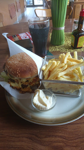 Read moreLiegt direkt an einer gut befahrenen Straße... Lärmpegel war aber ok im Außenbereich. Die Bedienung war sehr nett und sympathisch. Nicht nobel oder hochtrabend, sondern bürgerlich bodenständig. Habe mich wohl gefühlt dort. Das Essen kam innerhalb weniger Minuten an den Tisch. Da kann man wirklich nicht meckern. Die Teller waren auch ansprechend hergerichtet. Der pulled-chicken-Burger war ganz gut. Und die Schmorzwiebeln sind ein Traum... Weich, süß, saftig.... Und ausreichende Menge auf dem Teller. Toll! Nun zum negativen... Das Schnitzel war Standart Tiefkühlkost, genauso wie die Kartoffelspalten. Da hätte ich mehr erwartet. Die Bratkartoffeln haben nach Öl geschmeckt, etwas Speck... Aber kein Kartoffelgeschmack. Von BRATkartoffeln kann man nicht reden... Keine Krusten an den Kartoffeln, eher erwärmt in Fett.