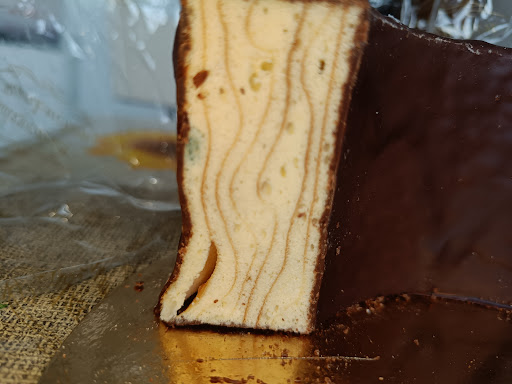 War ein netter Versuch, aber wie auf den Fotos zu sehen sind die Jahresringe recht zart ausgeprägt, der Kuchen an sich nahezu saftig und von der Konsistenz eher kompakt und ein wenig wie etwas halbroher Teig, den man so beim plätzchen backen mal nascht. Geschmacklich hat es daher vermutlich auch nicht so umgehauen.
