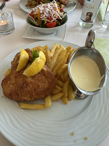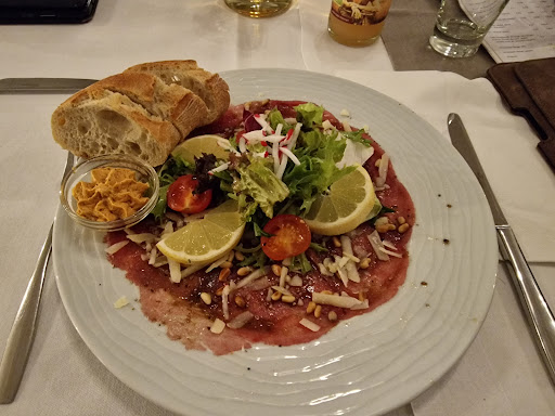Read moreWir haben online einen Tisch für 8 Personen reserviert, dieser wurde schön gestellt. Die Ausstattung und das Ambiente ist eher praktisch und ungemütlich. Das Restaurant war bis auf 3 Tische leer und es war sehr frisch von der Temperatur. Das Personal ist sehr freundlich und zuvorkommend, das habe ich so selten erlebt. Auch unsere Kinder wurden wahrgenommen und durften ihre Bestellung selbst aufgeben. Die Karte ist übersichtlich, aber sehr vielfältig. Von klassisch bis modern ist alles dabei. Die Getränke kamen schnell, die Vorspeisen auch. Das Carpaccio war ein Gedicht, eines der Besten die ich je gegessen habe. Die Schnitzel der Kinder waren frisch zubereitet, aber kein wirkliches Highlight, die Pommes schön knusprig, die Kürbissuppe hat meiner Frau geschmeckt. Die Hauptspeisen kamen auch in angemessener Zeit und waren alle samt okay. Preis/Leistung insgesamt gerade noch okay, schwankt aber von Gericht zu Gericht.. ..12 € für das Carpaccio in der Qualität super, 16,90 für ein Schnitzel mit Paprikasoße und Pommes für die gebotene Qualität zu viel in meinen Augen.. Fatzit: Gastraum zu kühl.. ..Personal super.. ..Essen okay.. ..wir würden wieder mal hinfahren, wenn wir in...