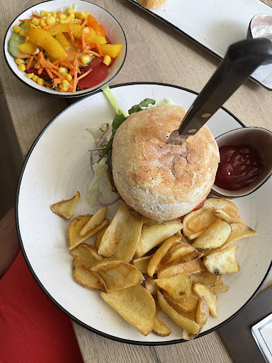 Was man noch optimieren könnte: stellt einen hübschen Besteckkorb mit Servietten und Besteck auf die Tische, die Einweg-Besteckverpackung macht den ansonsten schicken Eindruck kaputt die Burgerbrotchen weniger kross machen das selbstgemachte Chutney auf den Burgern ist super, aber die Mengen am Remoulade lassen das aber leider untergehen. Die Hälfte an Remoulade würde reichen. das Gemüse auf den Burgern nochmal mit Salz und Pfeffer würzen die Patties etwas dicker machen (gerne auch für den Euro mehr) dann können sie noch saftiger werden den Apfelkuchen vorher leicht anwärmen. Kühlschrankkälte macht ihn weniger lecker. Und für meinen Geschmack könnten da mehr Äpfel und...