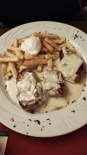 Wir haben Pizza bestellt, in der Annahme, dass man bei Pizza nicht viel falsch machen kann. Kann man. Die große Pizza ist nur 26 cm groß. Und für den Preis, bekomme ich beim Lieferdienst 32 cm und eine wesentlich bessere Pizza. Die ganze Pizza war einfach nur fettig und mit unglaublich viel Käse überladen, dass man nicht anderes mehr geschmeckt hat. Zu den anderen Speisen kann ich nichts sagen, aber wenn die Pizza schon nicht klappt, kann ich mir nicht vorstellen, dass man dort ein, auf den Punkt gegrilltes Rumsteak bekommt.