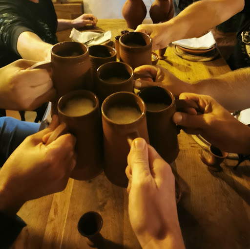 Der Tisch war dem Motto entsprechend arrangiert, so hatte ich mir das erhofft, aber es war besser. Die einzelnen "Gänge" kamen in einem angemessenen Abstand und das Essen war einfach genial. Sehr gute bürgerliche "ritterliche" Küche. Man kommt hier voll auf seine Kosten. Die Getränke aus Tonkrügen rundeten das Ganze ab. Alle waren mehr als zufrieden und beim Nachtisch haben sogar einige dankend abgewunken, weil sie einfach schon komplett satt waren. Highlight für unsere Großstädter: nein, eine Gabel gibt es auch beim Hauptgang nicht ;-) Vielen lieben Dank an die Familie Alex für diesen sehr schönen Abend in ihrem Restaurant und einen weiteren Dank, unbekanterweise, an die Gesellschaft am Nachbartisch für die musikalische...