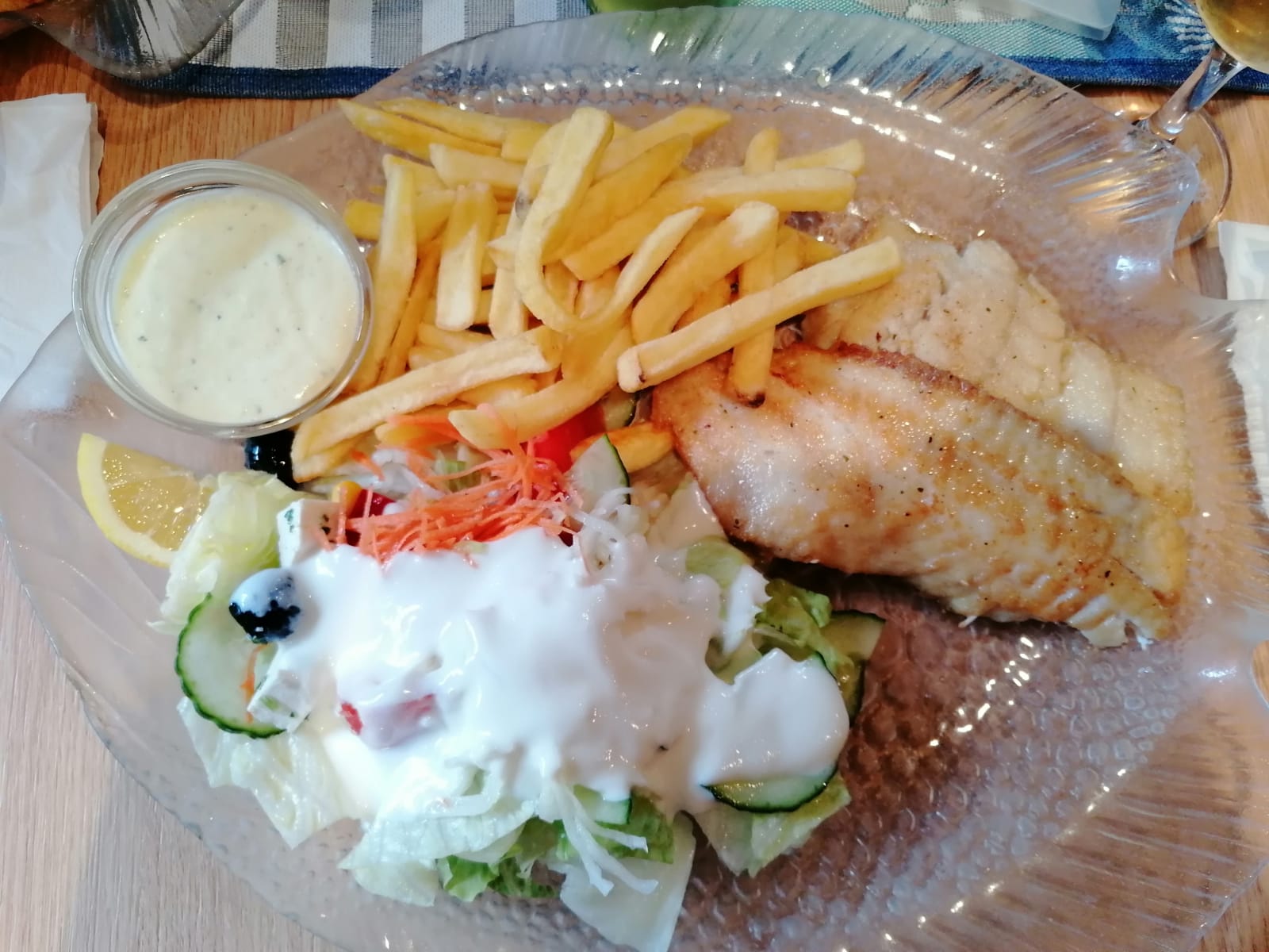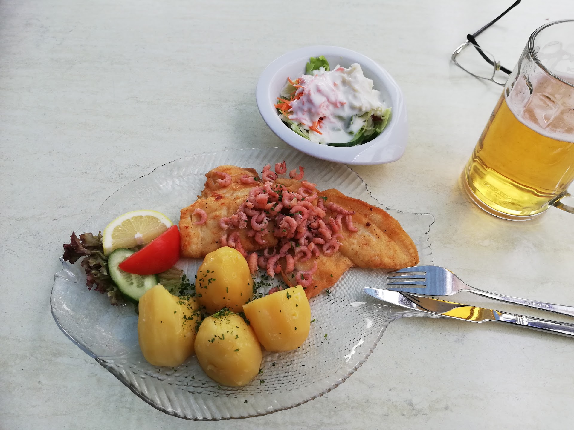 Aber nun zum Wesentlichen. Das Essen war lecker, der Fisch war gut gebraten, der hausgemachte eigene Kartoffelsalat ist ein Traum, an sich kann man ruhig sagen, alles sehr lecker. Einziges Manko meinerseits, Light Getränke gibt es wohl nur in kleinen Flaschen, aber das ist dem Imbiss geschuldet, ist an sich ja normal. Das Essen ist wie gesagt wirklich lecker, haben auch bereits zweimal auf die Hand uns etwas zum Essen mitgenommen, alles ist frisch und die Krabben sind auch ein Genuss.
