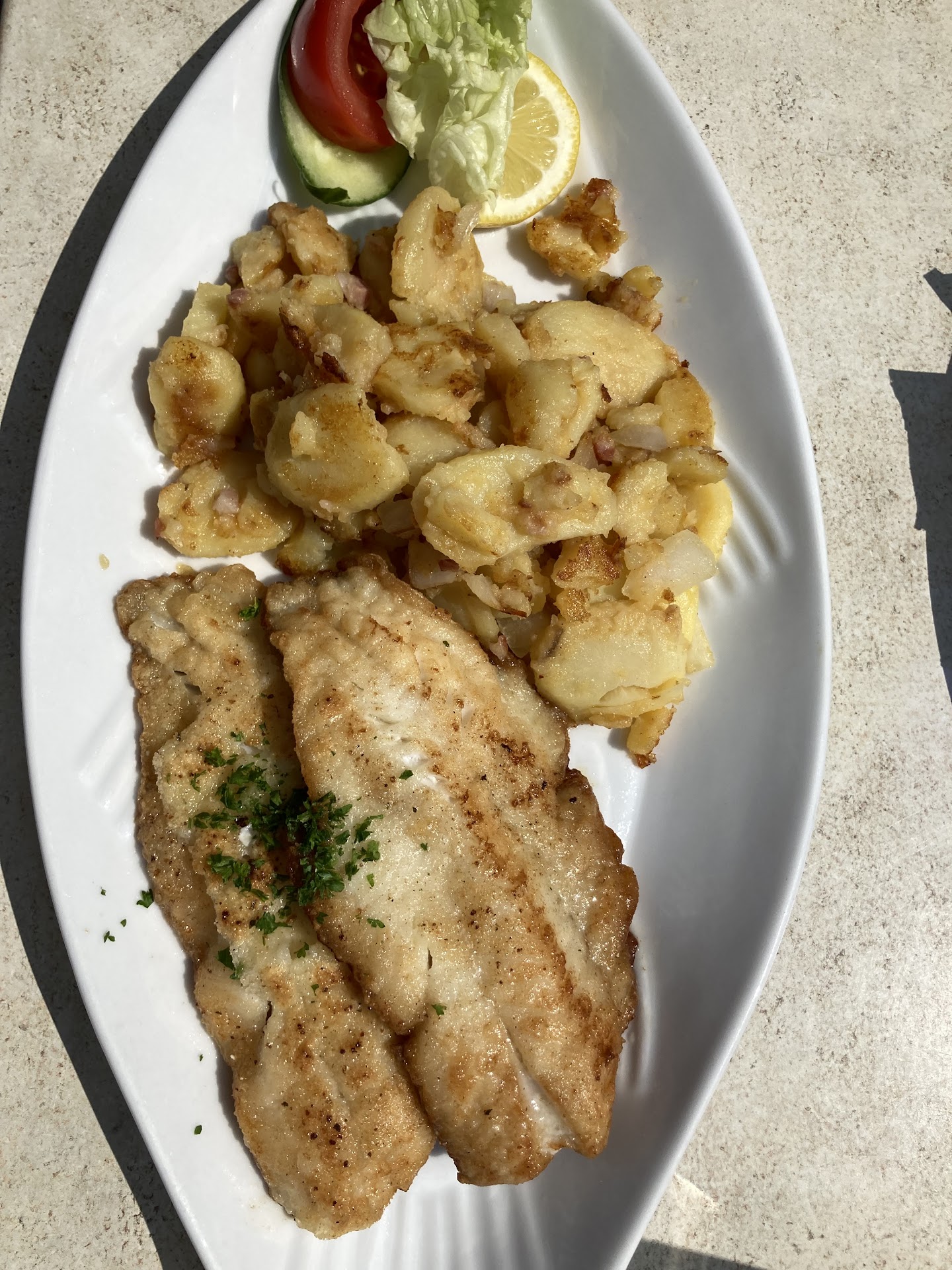 Read moreSagen wir mal so, ein bisschen Luft nach oben ist auf jedem Fall. Ich persönlich mag aber schon mal diese Art SB - Restaurant (so wie bei Gosch), bei der man nach dem Essen nicht Jahre auf den Kellner wartet, um zu bezahlen. Also gleich bei der Bestellung bezahlen, aufs Essen warten, essen und danach dann gleich entspannt auf den Deich. Das Essen ist absolut fein. Der Fisch ist gut und macht in der Auslage einen frischen Eindruck. Das Schollenfilet war super gebraten, der kleine Salat war ebenso frisch und hatte ein leckeres Kräuter-Dressing. Wenn ich anfangs von Luft nach oben gesprochen habe, dachte ich in dem Moment ein bisschen an die Bratkartoffeln. Man kann sich des Eindruckes nicht verwehren, dass diese NICHT frisch zubereitet, sondern industriell vorgefertigt werden. Geschmacklich OK aber von der Konsistenz wirklich ganz schön mehlig. Sagen wir mal so, richtig leckere Bratkartoffeln waren das jetzt nicht. Wo doch aber gerade Bratkartoffeln als Beilage zu Fisch ein MUSS sind. Klar, die Mengen, die an Bratkartoffeln am Tag rausgehen, sind eine Herausforderung aber dennoch, hier gibt es Handlungsbedarf. Tja, das Ambiente ist eigentlich gut. Der große Garten vor dem Restaurant macht die Lage echt gemütlich. Wenn man aber aufgrund des Wetters nicht auf der Terrasse sondern im Inneren des Restaurants sitzen muss, dann erwartet einen der klassische Küsten-Stil der 90er. Ein bisschen altbacken. Könnte man auch mit nicht großem Aufwand sicherlich ein bisschen schicker gestalten. Tut der Sache aber keinen Abbruch, insgesamt war das Essen gut, das Personal ist freundlich und das Preis-Leistungs-Verhältnis passt auch. 2 Personen Essen, Getränke dabei....Für einen Preis von 32 Euro ein...