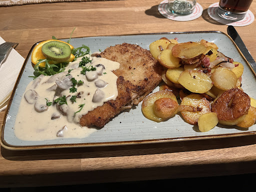 Das Essen war superlecker, wurde für die große Anzahl an Personen schnell serviert und war auch wirklich heiß. Ist auch nicht überall so. Das Schnitzel war auf den Punkt gegart und die dazu servierten Bratkartoffeln waren knusprig und nicht wie so oft in anderen Restaurants matschig.