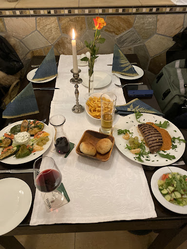 Freitag, 20 Uhr und im Restaurant waren 3 Tische besetzt. Dies wunderte uns schon sehr. Am vorbestellten Tisch angekommen wurde uns zügig die Karte gebracht. Von Griechisch über italienisch, alles dabei. Mein Mann bestellte Gyros überbacken in Metaxasauce. Ein Klassiker in bei jeden "Eckengriechen". Meine Wahl war ein Souvlakiteller. Vorspeise bei meinem Mann FETA überbacken und bei mir Bruscetta.