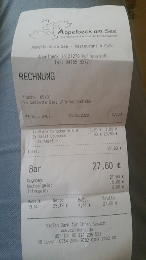 "Die ersten Lockerungsmaßnahmen der Korona-Krise. Klar das wir als Stammkunden dann gleich wieder nach Appelbeck fahren und versuchen das Restaurant zu unterstützen. Gastronomen haben es gerade nicht leicht. Bestellt haben wir 2 x Salat Couscous ohne Tagessuppe Bekommen haben wir zwei große Salate ohne Couscous und ohne Avocado-Creme. Wegen Corona gibt es kein Couscous und keine Avocado-Creme. Preis 2 x EUR 11,90. Früher hat der Salat mal EUR 9,90 gekostet. Ich will ja was für die Gastronomie tun, aber weniger Leistung, weniger Aufmerksamkeit beim Service und höherer Preis, damit möchte ich mich gar nicht erst anfreunden."