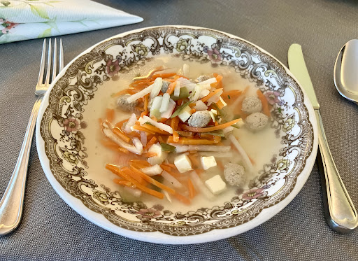 Als wir uns auf der Homepage näher informierten, fiel uns auf, dass das Lokal bereits um 18 Uhr schließt, wir reservierten für 16 Uhr. Die Speisekarte umfasste im Schwerpunkt Fischgerichten, außerdem Fleischgerichte und Salate, es gab eine separate Dessertkarte mit Eiskrem, Waffeln, Kuchen und Torten. Ich legte mich auf die Scholle Finkenwerder Art mit gemischtem Salat und Bratkartoffeln für 26,80 € fest, meine Gastgeberin wählte ebenfalls ein Fischgericht; zu beiden Gerichten gehörte eine Tagessuppe vorweg.