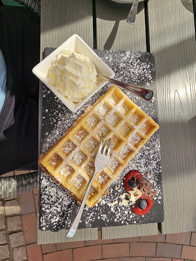 War heute kurz da, das Moped musste spazieren gefahren werden, es wollte raus. Die Bedienung war einfach nur freundlich und aufmerksam und absolut zu empfehlen. Selten habe ich so eine angenehme Bedienung gehabt. Ich hatte den Apfelstrudel mit Eis und Sahne und eine heiße Schokolade. Die Schokolade war etwas zu lauwarm, lag allerdings auch an meiner Verfassung, die Temperaturen waren noch nicht optimal und ich saß draußen. Der Geschmack war köstlich und die Aufmachung wirklich schön. Der Apfelstrudel war hausgemacht und kam wunderbar garniert daher. Eine Köstlichkeit, man konnte jede Zutat rausschmecken (Apfel, Zimt, Rosinen) und die Kugel Eis schmolz herrlich im Mund, und war ebenfalls ein Gedicht. Die Sahne war aus dem Spender, vermute ich, allerdings nicht aus der Dose. Es wurde auf einer Schieferplatte serviert, die liebevoll garniert war. Sehr schön. Habe mich noch ein paar Minuten unterhalten und der Eindruck des Lokalität wurde noch einmal bestätigt, absolut top. Freundlich, kompetent und am...