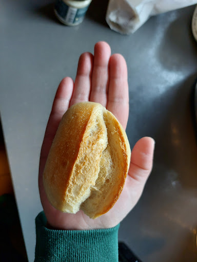 Nach einem Augenrollen hat die Dame dann angefangen das TETRA-PAK Rührei abzufüllen und zu braten. Wie haben uns dann schon einmal hingesetzt und angefangen unseren Kaffee und die Heiße-"Schokolade" zu trinken. Kennt Ihr diese heißen Kakaos aus den Automaten für damals 50Cent? Genau das war die Heiße-"Schokolade"...Kaum Schokoladengeschmack, einfach nur super süß. Wir haben dann das Rührei bekommen mit je einem trockenen Brötchen dazu. Als ich fragte, ob wir bitte noch ein bißchen Butter für das trockene Brötchen bekommen können, wurde gesagt, dass diese noch einmal 70Cent kostet. Also habe ich mit einem Augenrollen die "Butter" bestellt. Bekommen haben wir Pflanzenfett Margarine aus einem großen Pott.