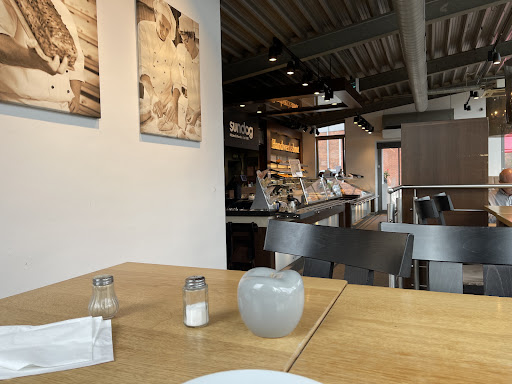 Ich hatte einen Espresso Machiato, Brötchen (Käse und Gurke) und ein Apfelkuchen.