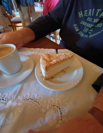 Read moreDas zum Café umgebaute Haus bietet zwei große Räume an. Die vielen Tische tragen Vintage-Damast-Tischdecken und drumherum stehen die gepflegten Stühle aus Omas Zeiten. Der eine oder andere Pfeiler mittendrin hindert nicht am Überblick quer durch das Café. Im Sommer kann man dort auch geschützt im Innenhof sitzen. Im modernem Kühltresen stehen die wirklich leckeren Torten und sie machen die Wahl nicht leicht. Verschiedene Heißgetränke runden das Ganze ab. Wir waren erstmalig heute hier zum Beerdigungskaffee...der Plattenkuchen schmeckte wie früher ;-) und die belegten Brote waren sehr appetitlich angerichtet und knackig. Die gesamte Belegschaft war unaufdringlich aufmerksam, sehr freundlich und schnell.