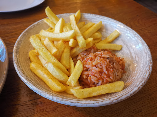 Sollte der Krautsalat und Tzatziki hausgemacht sein, so hat man es geschafft, dem Ganzen einen Konservencharakter zu verleihen, was nicht einfach wäre. Die Menge roher Zwiebeln macht das leider nicht besser. Der Tomatenreis muss nicht beschrieben werde, ebenso die obligatorischen Pommes.