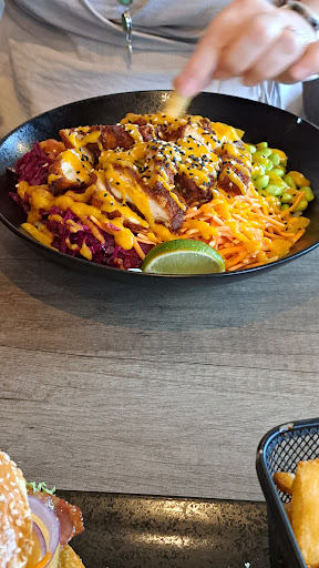 Het is druk. Erg druk. Vooral zo vanaf 19 uur. Het is mooi weer dus velen zitten buiten. Wij bevinden ons in het "VIP"-gedeelte alwaar de zachte stoelen heerlijk zitten. Het tafeltje mocht iets hoger. De zaak is heel mooi en smaakvol aangekleed. Ik denk dat het er nog geen 2 jaar zo uit ziet vanwege grote 2023 en 2024 letters aan de muur. De bediening is korrekt en zeker vriendelijk en attent. Alles gaat er dus echt op een "no problem man" tempo. De klant is er koning. De menukaart is simpel. En soms is minder "meer". De kaart laat je het water in je mond lopen. De diverse burgers, huisgemaakte pasta of de (poke)bowl zijn echt ontzettend goed. Denk er nog wat vrij te kiezen variaties van sauzen, groenten en frietjes bij en je avond kan niet meer stuk. De black Angus is een uiterst geliefde keuze voor een hamburger. De crispy chicken in de bowl is ook echt crispy en dat kan je niet altijd bij een ander restaurant zeggen. Let trouwens even op hoe je de "base" van de bowl wilt hebben. Met rijst, of met sla, of rijst EN sla. Dat concept kenden wij nog niet.