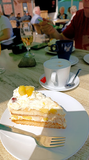 Wir waren hier im Hofcafe, welches vom Eigentümer geführt wird. Es gibt kalte und warme Getränke, Kuchen, Torte, Brötchen, Eis und warmes Essen. Sonntags können hier auch frische Brötchen geholt werden. Das Hofcafe wird mit Herz betrieben was der Charme im Inneren des Gebäudes 1:1 wiederspegelt. Das warme Essen ist super lecker. Dieses Mal waren wir jedoch zum Frühstücken hier. Wir hatten dafür einen Tisch bestellt, mit Lachs und gebratenem Schinken, Käse, Wurst, Eiersalat, Marmelade, Käsecreme, Eiern selbstgebackenem Brot, Orangensaft etc. Es war liebevoll angerichtet, auch unsere Gäste waren beeindruckt. Vielen Dank für dieses schöne Frühstück, wir kommen gern wieder. Nachmittags muss man auch unbedingt den selbstgemachten Kuchen probieren, der ist sehr lecker.. Wir kommen...