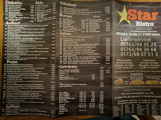 Diese Bewertung stammt von meiner Mutter, die hier ihren Lieblings-Döner- und Pizzaladen am Ort bewerten möchte. Sie ist mit ihren mittlerweile 83 Jahren vermutlich eine der besten Kundinnen vom Starbistro, weil sie mir ständig in den Ohren liegt und nach ihrer geliebten "vegetarischen türkischen Pizza" verlangt. Im Sortiment sind auch verschiedene Nudelgerichte, Salat und natürlich Kebab in allen Variationen. Außerdem gibt's einen Billardtisch und einen großen Fernseher zum Sport-Gucken. Die Jungs sind alle sehr nett und machen immer alles möglich. Einziger Nachteil für mich: Keine Hunde erlaubt. Kein Cliff, keine Kareen. Aber zum selbst abholen oder bringen lassen ist das ja...