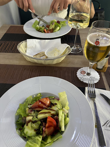 Waren hier essen, das Restaurant für sich ist schön eingerichtet und sauber. Auch gegen die Toiletten ist nichts einzuwenden. Wir hatten einen ganz schönen Platz und wurden auch prompt bedient. Die Karte ist, untypisch für ein griechisches Restaurant, eher sehr übersichtlich was die Gerichte und Zusammenstellung angeht. Sei es drum. Es gab einen Salat vorweg, frischer Blattsalat, Gurke und Tomate, darüber ein süßes Dressing und schwarzer Balsamico?? Egal, war wohl lecker. Dann kam zeitnah das Hauptgericht, in fast allen griechischen Tellern ist ein joghurtdip mit drin, soweit so gut. Leider verstehe ich nicht warum man dem beim Teller anrichten, wie in der Sterneküche, einmal über der Teller streichen muss??!! Dann wird alles andere darauf angerichtet. Sorry, ich finde sowas Mist! Für den extra bestellen Tzaziki gab es ein kleines Schüsselchen. So kann es auch machen!! Aber was mich richtig geärgert hat war, das die Küche über den fertigen Teller, ich glaube das gelbliche Salatdressing drüber gespritzt hat. Als ich mich nach ein, zwei Bissen eigentlich mal nachfragen wollte ob sich der Koch mit der Flasche vertan hat überschlugen sich am Nebentisch die Ereignisse, Glas herunter gefallen, sauber machen.... Und dann habe ich es gelassen. Ich werde definitiv nochmal wieder kommen, dann aber diese zwei Punkte ansprechen und...