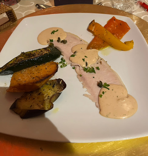 Doch dann das unfassbare, das Hauptgericht kommt an die Tische schnell und zügig, leider zu wenig Bedienung im Saal, denn Getränke wünsche gehen unter oder kommen falsch an den Tisch viel zu wenig Personal die Bar unbesetzt. Wieder eine schlechte Organisation des Verantwortlichen. 👎🏻 Aber nicht genug damit, das Fleisch ist fast ROH auf dem Teller, viele Gäste reklamieren ( WOHL NICHT ALLE DAZU SPÄTER ) und es geht zurück in die Küche. Der zweite Teller mit dem Hauptgericht kommt bei uns zügig an, Qualität auch nur so la la siehe Bilder.