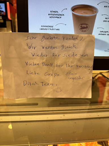 Read moreLeider sind diese Zettel ständig an dieser Filiale zu finden und selten handelt es sich um 15 Minuten…( jedes Grundbedürfnis gehört gestillt.. das steht außer Frage!!) Heute war z.b. eine Stunde keiner zu sehen. Wenn man mal eine Brezel ergattern kann sind sie echt lecker! Fangt doch mal an eure Leute vernünftig zu bezahlen, dann steigt auch die...