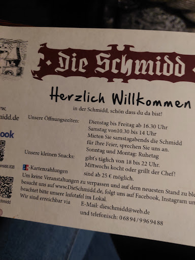 Read more"Die Schmidd" wäre ein echter Geheimtipp, wenn sie nicht bereits so bekannt wäre! ;-) Das urige Ambiente in der alten Schmiede mit seiner gemütlichen Einrichtung sorgt sofort für Wohlfühlstimmung. Es gibt einen Außenbereich mit altem Kastanienbaum, aber auch einen überdachten Bereich. Die Küche ist spitze! Sehr guten Flammkuchen bekommt man eigentlich immer, aber besonders empfehlenswert ist der Mittwoch, wenn Dirk kocht! Neben einer angenehmen Gesellschaft von jung bis alt und dem guten Musikgeschmack, sind ein weiteres Highlight meiner Meinung nach die regelmäßig stattfindenden Konzerte. Absolut...