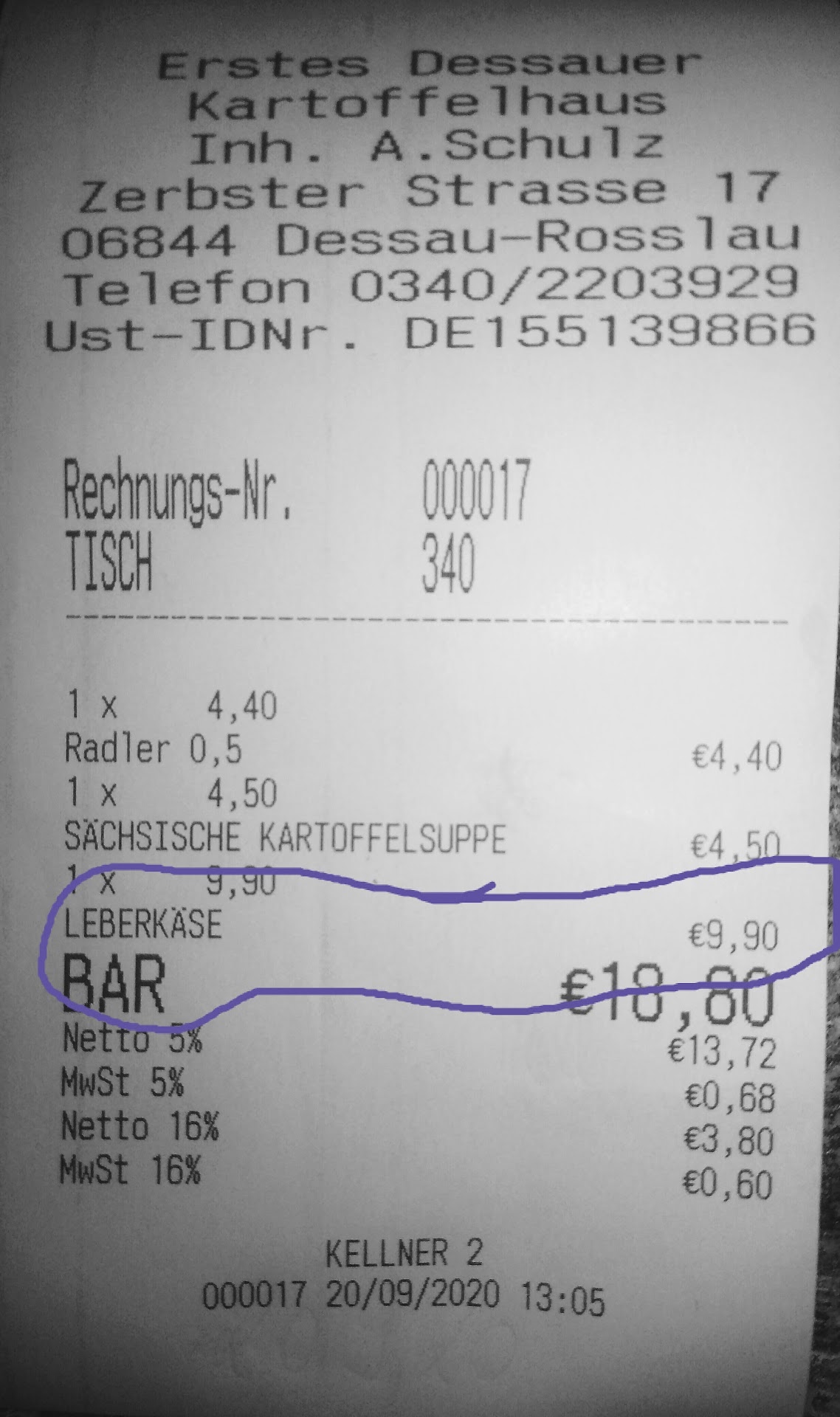 Read moreI had dinner at a street table outside this traditional German eatery close to the town hall of Dessau. Calf's liver Berliner art was on the menu for this night with an ongoing pole vault competition about 100 m away in front of the town hall. I learnt a bit about German Spätburgunders, not knowing they even make a sweet variant which was brought to my table served at above 30 degrees temperature to accompany my calf's liver. When I informed the waiter the wine was undrinkable he asked me what I thought he should do with it. Luckily someone more intelligent came to my table after a while and we sorted it out to my entire satisfaction. So be careful with what you order to drink if you don't know the local habits and rules. By the way the winner jumped 5.82, not too bad for a street...