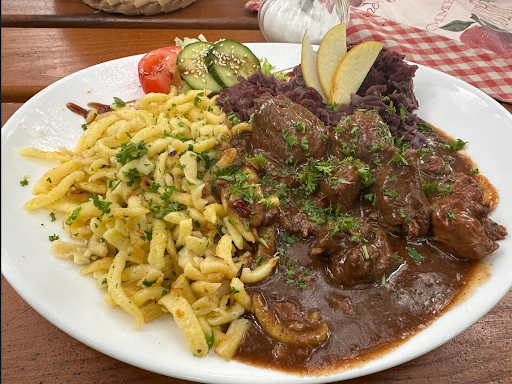 Read moreNach einer 90 km Radtour heute als Abschluss angedockt. Hier bedient Chef auch noch selber. Wir wurden sehr nett aufgenommen, haben unsere Getränke in wenigen Minuten erhalten. Das Essen hat die übliche Zeit gedauert, was für ein frisches Essen üblich ist. Wir haben nicht auf die Uhr geschaut, denke mal aber so 30–40 Minuten. Genug Zeit, um den Tag Revue passieren zu lassen. Frisch, heiß und unfassbar lecker in einer Qualität, die heutzutage ihresgleichen sucht, haben wir 2 Teller Waldgulasch mit Apfelrotkohl und Spätzle bekommen. Das Fleisch vom Lokalen Jäger geschossen super frisch und extrem zart, der Apfelrotkohl perfekt zubereitet und die Spätzle, freunde, die Spätzle. Perfekt in Butter angebraten, an allen Stellen genau das richtige nach einer langen Tour. Als Nachtisch haben wir den Kaiserschmarrn genommen, hier haben Sie es übertrieben, fluffig, heiß, knusprig, perfekt an allen Stellen, mit der Vanille Sauce, Apfelmus und Sahne mit Erdbeerscheiben.
