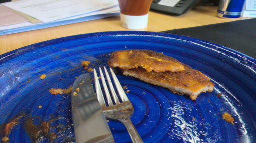 Die Pommes und der Salat waren gut. Das Schnitzel schmeckte neutral, sättigte und machte Bauchschmerzen. Ich fand das Schnitzel auch wieder recht trocken.