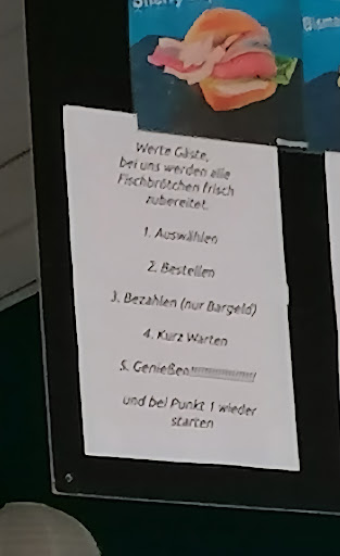 Read moreWir waren zu zweit im Bistro, um ein Fischbrötchen auf die Hand zu holen. Das Bistro war, bis auf einen Gast, leer. Nach der Bestellung sollten wir ein paar Minuten warten, da die Fischbrötchen frisch zubereitet werden. Mein Partner wollte sich für diese kurze Zeit an einen leeren Platz setzen, weit und breit keine Gäste zu sehen und zudem genügend andere freie Tische im Bistro. Der Inhaber kam direkt auf uns zu und erzählte mit arrogantem, unhöflichem Ton, dass es eine schlechte Idee sei, sich dort hinzusetzen, da der Platz für Gäste sei. Da frage ich mich, was waren wir zu diesem Zeitpunkt? Und welche Gäste sind gemeint, wenn weit und breit niemand zu sehen ist. Nur 2 Gäste, die sich etwas auf die Hand bestellen wollten, hier brachte der Inhaber ebenfalls einen unangebrachten Kommentar. Am meisten ärgert uns daran die arrogante und unfreundliche Art des Inhabers. Spricht man so mit seinen Gästen? Schade, dass mein Fischbrötchen zu dieser Zeit schon bezahlt war. Zu dem Brötchen kann ich jedoch sagen, dass es geschmacklich gut war....