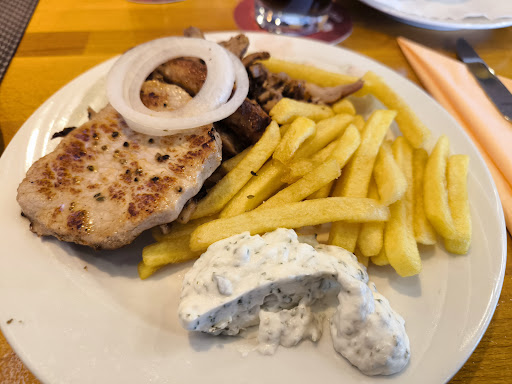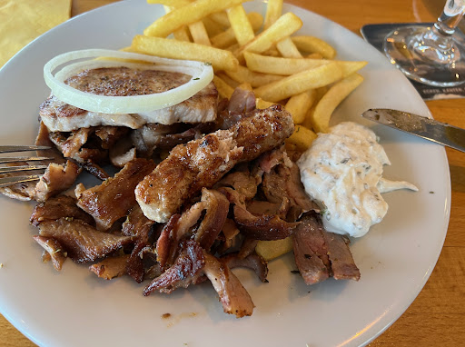 Read moreZum Mittagstisch spontan eingekehrt. Das freundliche Personal bot uns rasch einen Tisch an. Wir bekamen die Karten und wählten von der Mittagskarte Gyros mit Pommes und Souvlaki mit Pommes. Dazu wurde ein Salat vorweg gereicht. Der Salat war frisch, jedoch nur grün (Eisberg und Krautsalat). Ich hätte mir noch ein bisschen Farbe durch Tomate oder Paprika gewünscht. Ein rötliches Dressing war in Ordnung. Die Hauptgänge kamen prompt und auf den ersten Blick muss ich sagen "eine kleine Portion". Ein bisschen Gyros, ein paar Pommes bzw ein Souvlaki-Spieß mit Pommes, dazu jeweils einen Klecks Zaziki. Fangen wir beim Positiven an: der Souvlaki-Spieß war sehr zart, von der Portion im Nachhinein mehr als ausreichend. Die Würzung war jedoch anders, als ich einen Souvlaki-Spieß aus diversen anderen Restaurants kenne, jedoch nicht schlecht! Nun zum Negativen: das Gyros war sehr trocken und sehr überwürzt, teilweise einen höheren Fettanteil. Das Zaziki kann man geschmacklich als Zaziki durchgehen lassen, etwas Pepp fehlte uns dann doch. Dazu wurden rohe Zwiebeln in einer wahrscheinlich"fertig-Paprikasoße" serviert. Wozu die gehörten, weiß ich nicht, jedoch passte es auch zu keinem der beiden Gerichte. Als Dessert wurde ein Vanilleeis mit einer Soße gereicht. Dieses war in Ordnung!