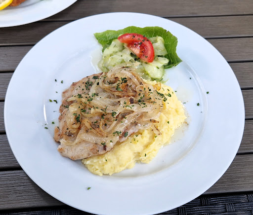 Auf der Speisekarte bestellte ich „Schweinefilet-Medaillons mit Kartoffelstampf, gedünsteten Zwiebeln und Gurkensalat“. Schweinefilet, auch bekannt als Filet oder Lendenfilet, ist das zarteste und magerste Stück Fleisch vom Schwein, das aus der Rückenpartie nahe der Wirbelsäule stammt. Es wird in Medaillons geschnitten – kleine, runde Scheiben, die schnell gebraten werden können. Was mir jedoch serviert wurde, waren zwei Stück Minutensteaks, dünne ca- 1cm hohe Schnitte, die aus dem Schinken oder der Schulter des Schweins stammen und schnell bei hoher Hitze gebraten werden. Diese sind deutlich weniger mager und haben eine stärkere Faserung als das Schweinefilet, selbst wenn Schweinefilets flach geklopft werden – was unüblich ist – sind sie niemals so dünn und steakähnlich vom aussehen wie das, was mir serviert wurde. Das servierte Fleisch hatte keine Ähnlichkeit mit den erwarteten, dicken und zarten Medaillons. Als ich meine Bedenken höflich zur Sprache brachte, reagierten die Inhaber nicht empfänglich. Der Inhaber kam zu meinem Tisch, zeigte mir ein unbenutztes Stück Schweinefilet und behauptete, dass dies das Fleisch sei, das sie verwenden würden. Es war jedoch offensichtlich, dass das gezeigte Fleisch nicht das war, was auf meinem Teller landete. Diese Aktion wirkte eher wie eine Inszenierung, die meine fachlichen Bedenken nicht ernst nahm. Statt dessen wurde mir unterstellt, ich hätte ja keine Ahnung was ich da rede, die Reaktion des Inhabers war abweisend und aggressiv. Eine weitere Anmerkung von mir: Aufgrund des geringeren Durchmessers des Schweinefilets (6-7 cm), ist es schwierig, daraus Steaks zu schneiden, die die Größe und Form von typischen Minutensteaks haben, die breiter und flacher sind. Minutensteaks werden üblicherweise aus größeren und flacheren Teilen wie dem Schweinerücken oder der Schulter geschnitten, was es ermöglicht, breitere und dünnere Steaks zu erhalten, die schnell garen. Wenn das Schweinefilet wie eine längliche Rolle auf deinem Schneidebrett liegt, sollte man tatsächlich senkrechte Schnitte machen, ähnlich wie beim Brot schneiden. Das Ziel ist es, gegen die Faserrichtung des Fleisches zu schneiden. Die Fasern laufen längs durch das Filet, und durch senkrechtes Schneiden (quer zu den Fasern) erhält man zarte Stücke, da die Fasern verkürzt werden. Die Filet Medaillons haben beim Schneiden eine typische Dicke von 1 Zoll (2,5 cm). Also viel dicker als die dünnen 1 cm Steaks die ich auf dem Teller hatte.