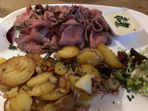 Wir hatten 3 mal das Wiener Schnitzel und den Putenburger. Das Wiener Schnitzel war verbrannt und so trocken, dass man es nur mit seinem Getränk herunter spülen konnte. Die dazugehörigen Bratkartoffeln, waren Kartoffelscheiben, die einfach nur in die Fritteuse geworfen wurden (auch diese waren nur noch trocken). Der Burger konnte leider auch keinen Stern gewinnen. Zum Nachtisch hatten wir Kaiserschmarrn. Leider hatten wir diesen bereits mit dem Hauptgericht zusammen bestellt. Dieser wurde dann auch direkt mit dem Hauptgang geliefert. Der Kaiserschmarrn war stark karamellisiert und dadurch relativ hart. Hätten wir zuerst unser Essen bekommen hätten wir den Nachtisch definitiv nicht bestellt.