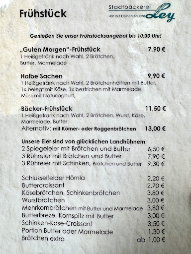 Read moreEchtes Bäcker Handwerk, Familien-Unternehmen - also keine Kette, kein Vorgebackenes, Teiglinge oder Ähnliches das kostenoptimiert" produziert und dann au X Fillialen verteilt wird. Wer also kein 0815 sucht ist hier richtig. Wir wollten auf der Heimfahrt irgendwo in Schlüsselfeld frühstücken und sind - glücklicherweise! - bei der Stadtbäckerei Ley gelandet. Eine Bäckerei mit Café, die schon am frühen Morgen Frühstück anbietet? Klingt super. Und ist super. Frühstücks Karte mit vielen Optionen. Aufstrich-Mengen die reichlich zu den Brötchen passen. Knackige Backwaren. Lecker! Also wenn zwischen Nürnberg und Würzburg frühstücken, dann in...
