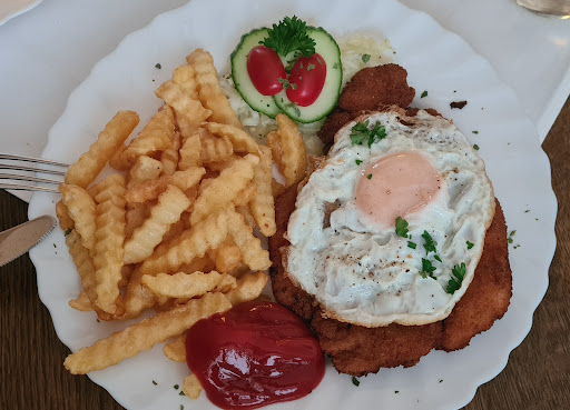 Die Karte ist sehr übersichtlich (man muss also nicht ewig blättern), und das Essen war absolut in Ordnung: geschmacklich gut, Portionen völlig okay. Mein Schnitzel mit Spiegelei hat 20 € gekostet – dafür war ich zufrieden.