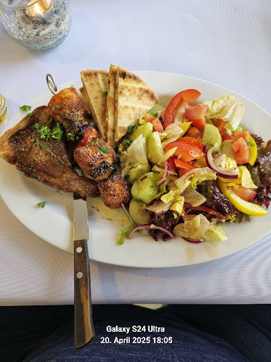 Read moreEin stilvoll eingerichtetes Restaurant im griechischem Stil. Die Bedienung ist freundlich und schnell und die Getränke und das Essen werden schnell serviert. Die Speisekarte fällt leider sporadisch aus, dafür ist die Getränke und vorallem die Cocktailkarte zu üppig und für ein griechisches Restaurant unüblich. Bestellt wurden 1x Schweinemedaillons in Metaxasoße mit Pommes und 1x Grillmixplatte mit Tsatsiki und Salat. Die Schweinemedaillons waren leider übergart aber ansonsten in Ordnung. Die Pommesportion sollte überdacht werden, es waren einfach zu viel. Kommen wir zur Grillplatte. Leider sind die Tiere für umsonst gestorben. Alles Drei`s war zu lange auf der Grillplatte und dadurch total trocken. Außerdem wurden falsche Angaben auf der Speisekarte gemacht, es wurden laut Speisekarte kein Schweinebauch, sondern Nacken serviert. Leider wurde das Tsatsiki vergessen und mußte nachgeordert werden. Des Weiteren erwarte ich für einen Preis von 26,60 € nicht nur jeweils ca. 80 Gramm Fleisch. Der dazu gereichte Salat war aber total in Ordnung, frisch und gut mariniert. Der Preis für die Schweinemedaillons von 22,90 € sollte auch noch einmal überdacht werden. Es sollten lieber die Getränkepreise etwas erhöht werden, dafür die Speisen preislich angepasst werden. In Gera und Berlin haben wir noch nie soviel beim Griechen bezahlt. Den abschließenden Ouzo, wie üblich, gab es hier auch nicht. Mit einem griechischen Restaurant hat dies leider nichts zu tun, man sollte das Konzept überarbeiten, da es schade ist für das freundliche Restaurant, die schöne Umgebung und dem Flair...