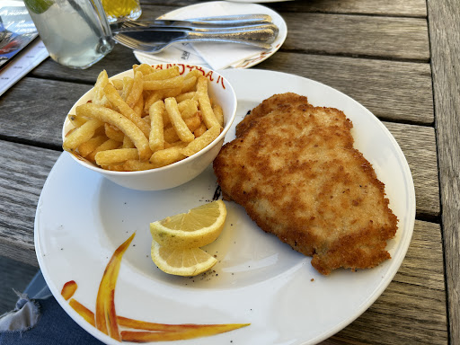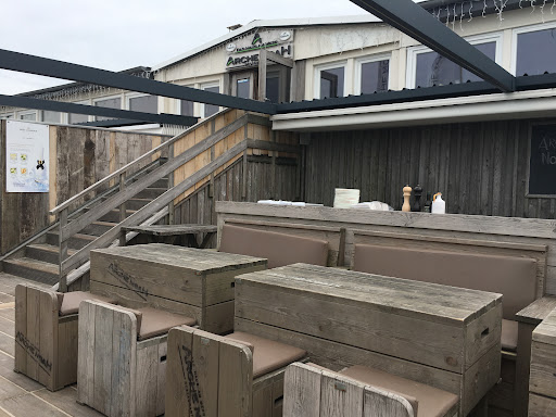 The restaurant is located in a renovated stilt house formerly known as Arche Noah. It has a large patio circling the restaurant with a self-service bar and several ‘Strandkoerbe’ (two-seat beach cabanas/beach chairs) downstairs at the beach where you can spend the day, afternoon, and in particular the sunset. After dinner you have to try their own-label grappa, which you actually can buy on site and in selected supermarkets.