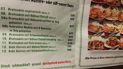 Nachdem wir das Gericht "knusprige Ente" und das gleiche Gericht mit Huhn (Nr18 und 22) erhalten haben, waren wir enttäuscht vom Geschmack. Es war eine recht große Portion Reis und das Gemüse hatte wenig asiatisches. Vereinzelt konnte man Sprossen finden aber ansonsten sehr Karotten- und Broccolilastig. Das Gemüse war aber nicht verkocht. Die Soße war geschmacklich okay aber es hätte ruhig mehr sein können. Wir haben allerdings auch nicht nach einem Nachschlag gefragt. Für den angesetzten Preis erhält man bei der Konkurrenz schmackhafteres Essen. Beim Essen und auch danach konnten wir die Abläufe beim Verkauf und in der Küche beobachten. Ein Kunde hat sich umentschieden und wollte sein Gericht nun doch zum Mitnehmen haben. Kurzerhand wurde das Gericht vom Teller in die Mitnahmeverpackung gefüllt. Den schmutzigen Teller hat dann der nächste Kunde bekommen. Der Blick in die Küche hat mich entsetzt. Der Koch hat auf einer Servierplatte welches er über einer offenen Mülltonne abgesetzt hat das Gemüse geschnitten (s.Foto). Sein Kollege ist dann immer wieder in die Küche gelaufen und hat aus einer Flasche Bier getrunken. Der Ort wo der Geschirrwagen steht (s. Foto) sowie die Küche selbst würde ich als recht unsauber einstufen, zumal auch mit irgendwas gefüllte schmuddelige Plastiktüten in der Küche rumhängen. Chinesisch kenne ich anders. Hier wird kein Essen mit dem Herzen zubereitet. Hier kommt nur billige Masse auf den Teller. Wir werden hier jedenfalls mit diesen beiden Herren hinterm Tresen nie mehr was...