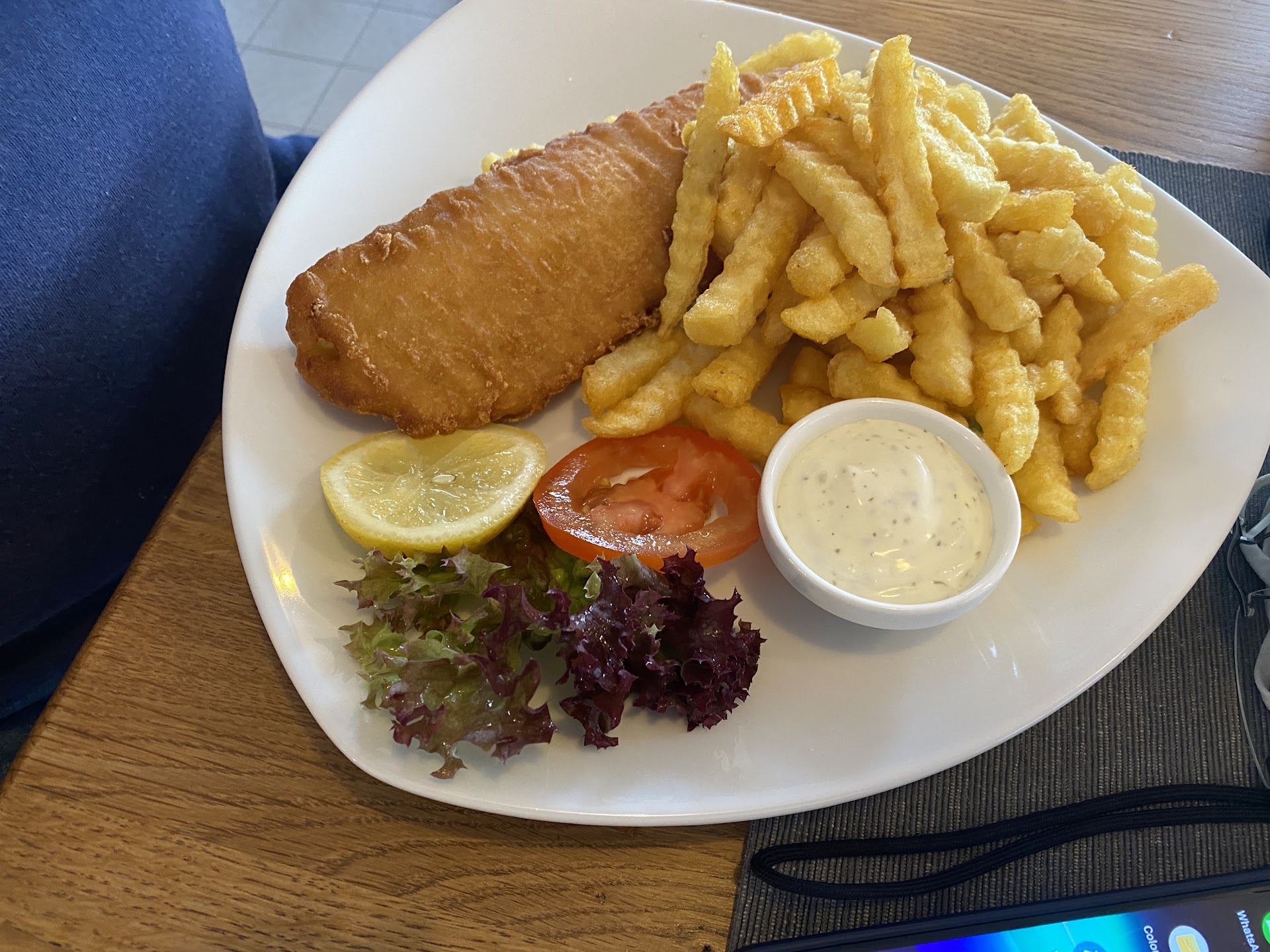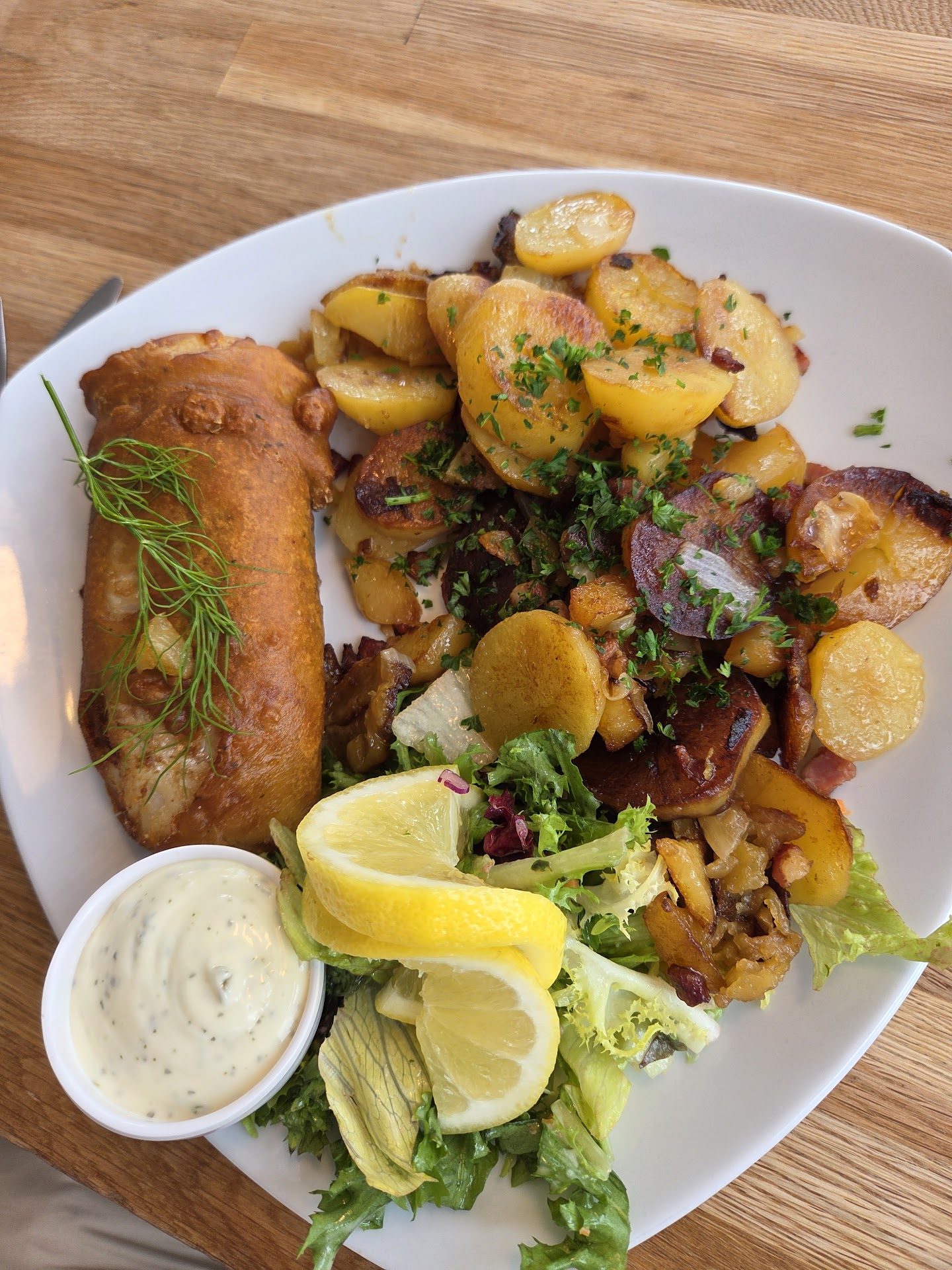 Die Bestellung wurde dann recht schnell aufgenommen undbezahlt. Das Essen sollte frisch zubereitet werden... Pieper gab es mit, das Essen sollte auf Abruf spĂ€ter abgeholt werden. Ărgerlich war nur das unser Essen nach 40 Minuten immer noch nicht fertig war. Alle anderen um uns herum hatten schon ihr Essen. Unsere Begleitung war schon fertig mit essen als unseres nach Anfrage dann fertig wurde. Pannfisch mit Bratkartoffeln... Bei frisch zubereitet erwarte ich heiĂes Essen. Leider falsche Erwartung gehabt. Dazu schwammen die Bratkartoffeln im Fett.