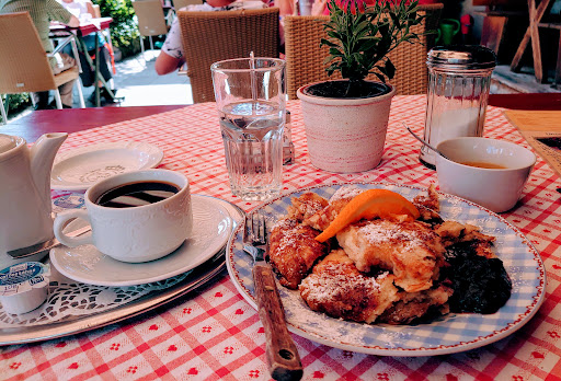 Food & Drinks: Iced coffee and Iced chocolate were good. We also ordered Spinach dumplings in butter sauce and it was very nice. However, we also ordered Gulaschsuppe and that was really bad. It's anything but Gulasch. It was sour, with potatoes, red beans, corn and barely any meat. The thing didn't taste at all like Gulasch and I would guess it's chilly con carne from the can warmed up in the microwave. I was a bit shocked as even the small bits of meat (corn size) were more of a texture of meatballs you get from the soup in the bag. It was truly disappointing and caused a heartburn for the rest of the day from how sour it was.