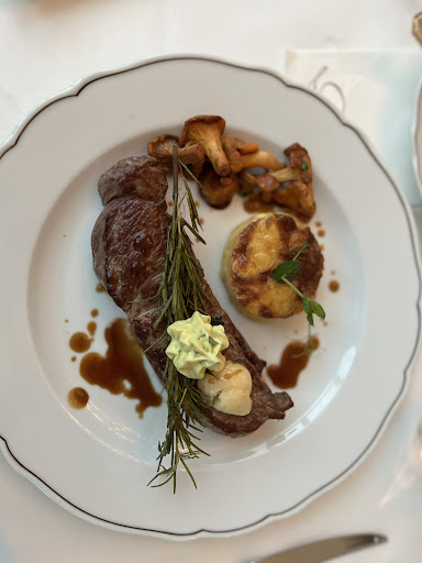 Wir waren am 27.09. anlässlich meiner Geburtstagsfeier im A-La-Carte-Restaurant. Die Karte ist klein, übersichtlich und hat für jeden etwas dabei. Wir wurden sehr herzlich empfangen. Nach einem Apéritif entschieden wir uns für ein Pilzcarpaccio und Lachsforellentatar als Vorspeise. Ich empfand das Tartar etwas mild, der Pfiff fehlte irgendwie. Unglaublich aromatisch das Dillsträußchen (das meine ich vollkommen ernst, der war super-frisch). Die Radieschen und die Kürbiskerne gaben den nötigen -Biss. Insgesamt sehr gut durchkomponiert. Als Hauptgang nahm ich ein Rumpsteak, das mit ca. 250g ordentlich ausfiel. Geschmacklich tippe ich auf Südamerika (Uruguay?). Auch beim Kartoffelgratin fehlte mir etwas der Pfiff - aber das war auch gar nicht nötig, denn es gab eine unfassbar großartige Portweinsauce dazu. In der Ergänzung brauchte ich die Kräuterbutter gar nicht, so köstlich war die Kombination. Der Jahre alte Bordeaux passte wie die Faust aufs Auge. Nach einer Crème Catalán und einen Espresso ging es zum Abschluss an die Bar.