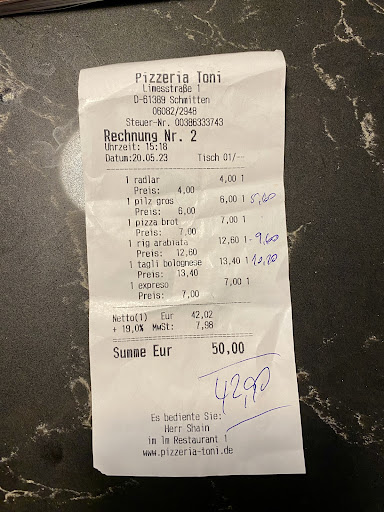 Read moreTruly surprising experience. Quite nice place to have main course and dessert. There is big parking close to it, so you won't have problem to drive here. Staff is quite friendly, but speaks German. Owner was ready to help with choice. We tried pizza and spaghetti, both were quite good. Definitely recommend to try Toni pizza if you are up to unusual taste combinations. They also have good drinks choice. Apfelschorle was really tasty. Overall place is quite clean and tidy. Cozy atmosphere included. :) You will hardly find any tourists here, so this might be a perfect choice if you are searching for something out of Frankfurt. I didn't understand which payment options were available. Owner was hesitant about cards, so I had to pay...