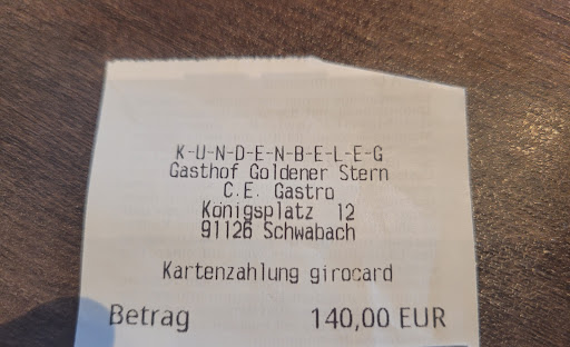 Die Inneneinrichtung ist wirklich sehr schön. Wir (drei verschiedene Haushalte) empfanden die männliche Bedienung vom Verhalten her etwas drüber. Die Mädels waren sehr freundlich und dauernd am rennen. Das Schäufele war recht klein. Es wurde allerdings vorab gefragt, ob zwei Knödel gewünscht werden. Der Zwiebelrostbraten war nach Angabe der mit Essenden wohl gut in Geschmack und Konsistenz bei einem davon wurde etwas flachsiges Fleisch aussortiert. Das doch recht kleine Welsfilet war leider in Panade erschlagen nebst einem Berg sehr fettiger Bratkartoffel. Also wieder Kartoffel statt Fleisch wie beim Schäufele. Salatboquet.. kann man so machen. Besser als keiner. Preis zusammen (Welsfilet mit Bratkartoffel und Salatbouqet auf dem Teller)ca. 25Euro. Allgemein fehlte dem Cordon Bleu Salz und Pfeffer. Portionsgröße war hier gut. Wir fahren für dieses Essen zu diesen Preisen nicht mehr extra nach Schwabach. Schulnote 3-4. Preis 5 Personen plus Trinkeld 140 Euro. Ich wünsche dem Gasthaus trotz den Mängeln alles Gute für die Zukunft und hoffe das in meiner schönen Heimatstadt an diesem tollen Standort wieder dem Ambiente und der Lage entsprechendes Essen serviert wird. Nachtrag: Es wurde versucht, gegen diesen Eintrag Einspruch einzulegen, daher war er einige Zeit verschwunden. Das lasse ich mir nicht gefallen, jetzt ist er nach Prüfung von Google wieder da. In wie weit die Gesamtbewertung dann bei Löschversuchen stimmt, ist fraglich. Ich war doch nochmal im Stern. Das Essen (Salatteller mit Pilzen)war diesmal besser, die weibliche Bedienung außen sehr freundlich, wenn auch etwas vergesslich...weitere...