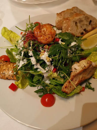 Wir waren um 18.30 Uhr vor Ort, das Restaurant war zu diesem Zeitpunkt zu 40 % mit Gästen gefüllt. Meine Wahl fiel auf den großen bunten Salat „Fischvariation“ mit gebratenen Lachs, Zander, Garnele und Baguette für 17,90 Euro. Ein Preis, der natürlich eine gewisse Erwartungshaltung in mir weckte! Da die zwei Fisch Hauptgerichte der Karte mit knapp 20 Euro aufgerufen wurden, war mir natürlich klar, dass keine riesigen Fischfilets auf meinem Salat drapiert werden würden. Ich wartete also gespannt, nach ca. 55 Minuten auch mit einem sehr großen Hungergefühl, auf meinem Salat. Da stand er nun, auf einem unspektakulären weißen Teller – eine Garnele, zwei Stückchen Zander und ein wirklich sehr trauriges Stück Lachs! Dieser hätte vielleicht lieber, auf Grund der Dicke, ein Räucherlachs werden wollen! Ein wenig gelähmt von dem Anblick probierte ich den Salat und eine Geschmacksexplosion blieb natürlich aus. Das Dressing, nun ja, auch nicht mehr wie Standard – keine Raffinesse an Gewürzen. Das erste Stückchen Zander mit Gräten durchzogen – eigentlich schon fast eine Kunst bei so homöopathischen Mengen an Fisch auf meinem Teller. Der Zander war noch fast roh – der Lachs zwei Mal gestorben – die Garnele komplett durch. Ich entschied mich, die Restaurantleitung über meine Enttäuschung zu informieren. Nach einem kurzen Gespräch gab ich meinen Teller frei, damit die Küche entsprechend über die Reklamation informiert werden konnte. Da saß ich nun, immer noch hungrig, weitere 7 Minuten gingen ins Land. Dann kam mein Teller – der Fisch war mittlerweile kalt, es wurden keine Ergänzungen vorgenommen, sondern der Teller wurde mir original wieder so auf dem Tisch gestellt, wie ich ihn zur Reklamation in die Küche gegeben hatte. Zusätzlich erhielt ich noch die Erklärung, dass so ein Salat für diesen Preis, nur in dieser Ausführung möglich wäre, weil die einzelne Garnele bereits mit 3 Euro in der Kalkulation zu Buche schlägt! Sprachlos über das Geschehene habe ich mich dann widerwillig meinem Schicksal hingegeben.