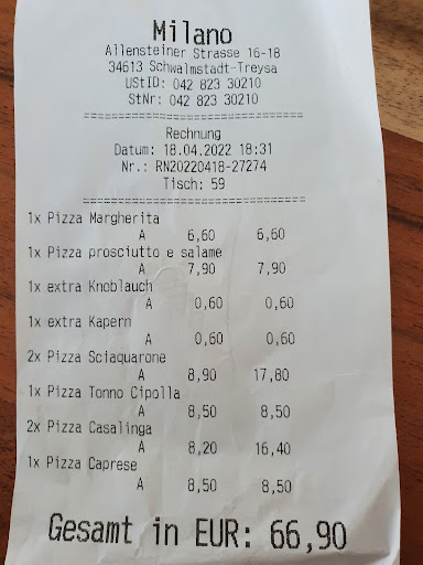 Schade schade schade. 🤨 Man geht (wir jedenfalls) essen, um nicht nur gut und lecker zu Essen sondern auch, um in schöner Atmosphäre freundlich bedient zu werden. Rundum gelungen und positiv in Erinnerung bleibt, wenn das Restaurant es schafft, das alles hinzukommen. Dann geht man anschließend mit einem Lächeln, satt und geschmacklich sehr zufrieden, gut gelaunt nach Hause. Im Falle vom heute im Milano erlebten, schaffte man es durch eine einzige Bedienung und dessen unsympathischen Auftreten, das sehr gute Essen was es dort zu gibt, zu zerstören. Ich muss allerdings auch sagen, das der junge Mann hinterm Tresen und die junge Dame die bedient, super freundlich und gelaunt, gekonnt ihren Job hervorragend gemacht haben. Aber wie das so ist, wenn es welche gibt die das alles schaffen mit fehlendem Fingerspitzengefühl zu zerstören, dann nutzt am Ende das beste Essen und auch die tollen Angestellten nichts und es bleibt ein schlechter Eindruck höhten. Daher lieber Chef (nehme ich an), bekommen Sie und Ihr Restaurant leider keine gute Bewertung. Sorry, aber der Kunde muss nicht unbedingt als König behandelt werden, aber auf keinen Fall wie eine Nummer die zu Ihrem Feierabend stört, weil ich als Kunde in Ruhe noch das Getränk austrinken möchte, der pro Person 40€ da gelassen hat. Lange nicht mehr so ein „arrogantes“ auftreten erlebt. Ansonsten hätte es 4 Sterne für ein tolles Essen und gutes Ambiente gegeben. Sie sollten mal an Ihrem Auftreten arbeiten, auch ihren Angestellten gegenüber, denn gute Leute findet man heute auch nicht mehr so leicht!...